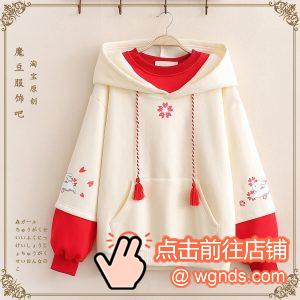 爱爱丸独家定制 (直达淘宝APP):我以前不是很喜欢这个店的衣服,总感觉是甜腻的少女风,但是最近偶然打开一看,今年秋季的衣服居然都挺好看的,这件红色的卫衣也是高腰的,薄薄的,很适合换季,帽子上还有三个金属圆环,把帽子带起来绝对酷酷的。关键是黑色也很好看啊!