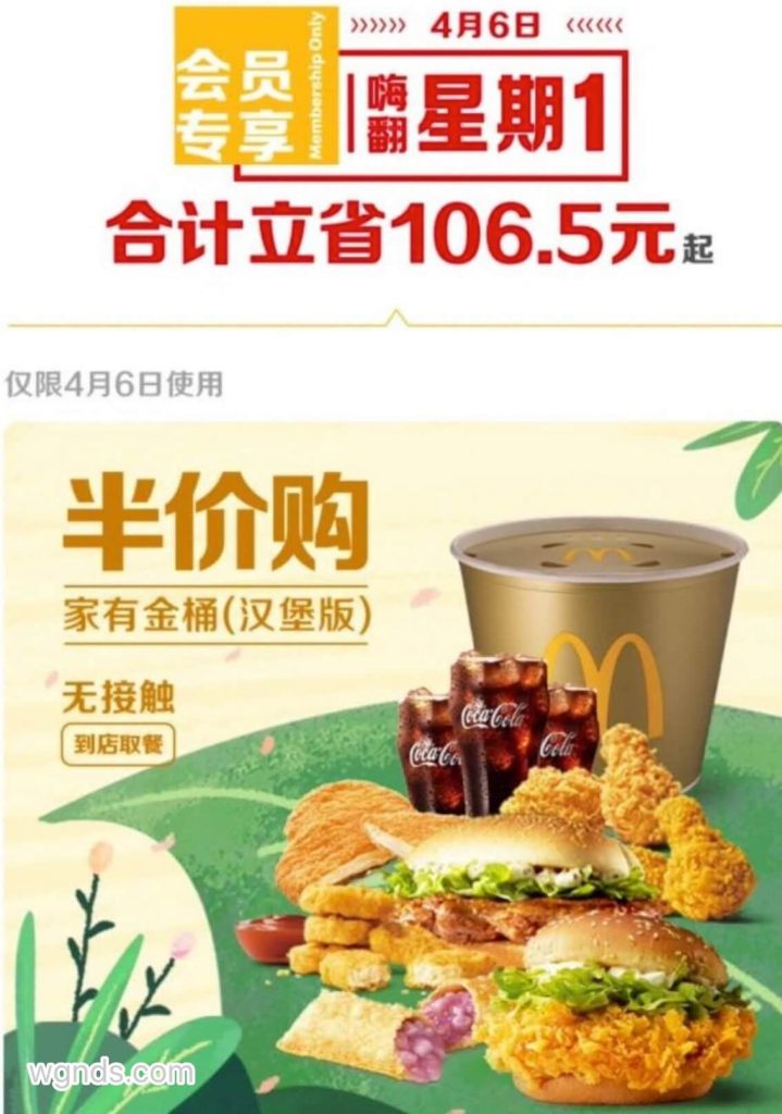 网购那点事小编又给各位宝宝们带来福利消息哦。2020年4月6日麦当劳家有金桶汉堡版特价39元哦,可省106.5元。只限2020年4月6日麦当劳小程序点单然后到店取餐可用。